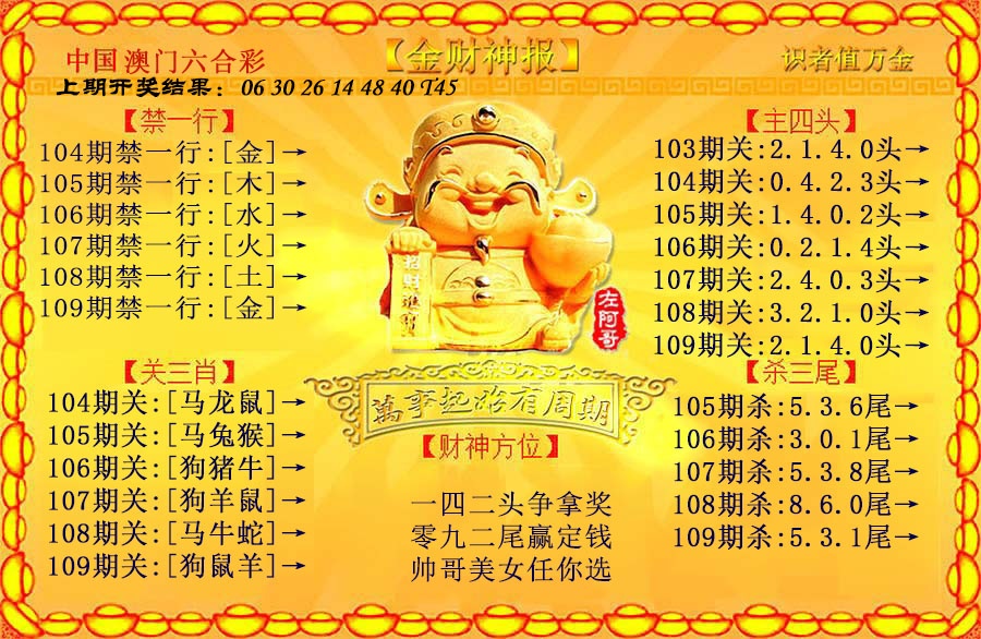 109期: 澳门六合宝典彩圖信封【黄财神报】每期自动更新